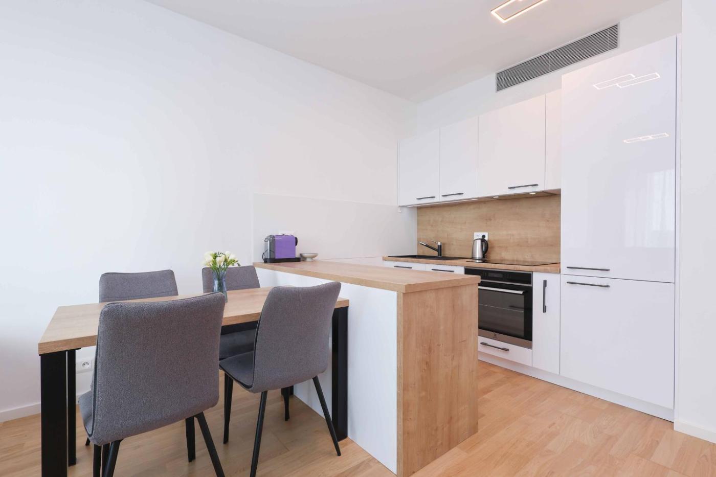 One-Bedroom Apartment. This air-conditioned apartment consists of 1 living room, 1 separate bedroom and 1 bathroom with a bath. Guests can make meals in the kitchen that is equipped with a refrigerator, a dishwasher, an oven and a tea and coffee maker. Featuring a balcony with city views, this apartment also provides a washing machine and a flat-screen TV. The unit offers 2 beds.