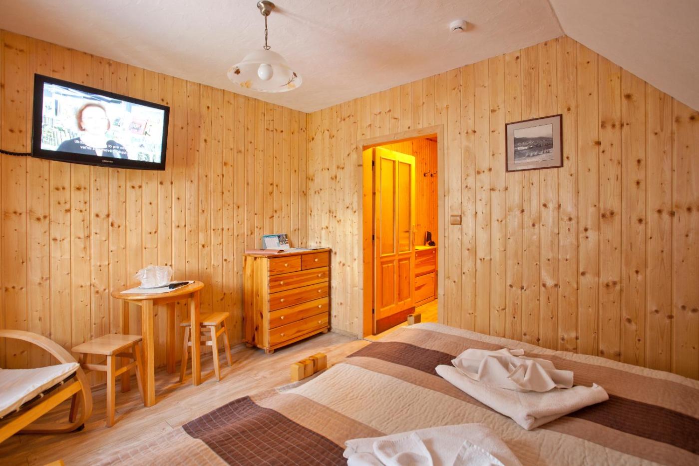 Double or Twin Room. Decorated in traditional Slovak style, this room with hardwood floors, wooden walls and furniture, comprises an LCD TV and a bathroom with shower. ;