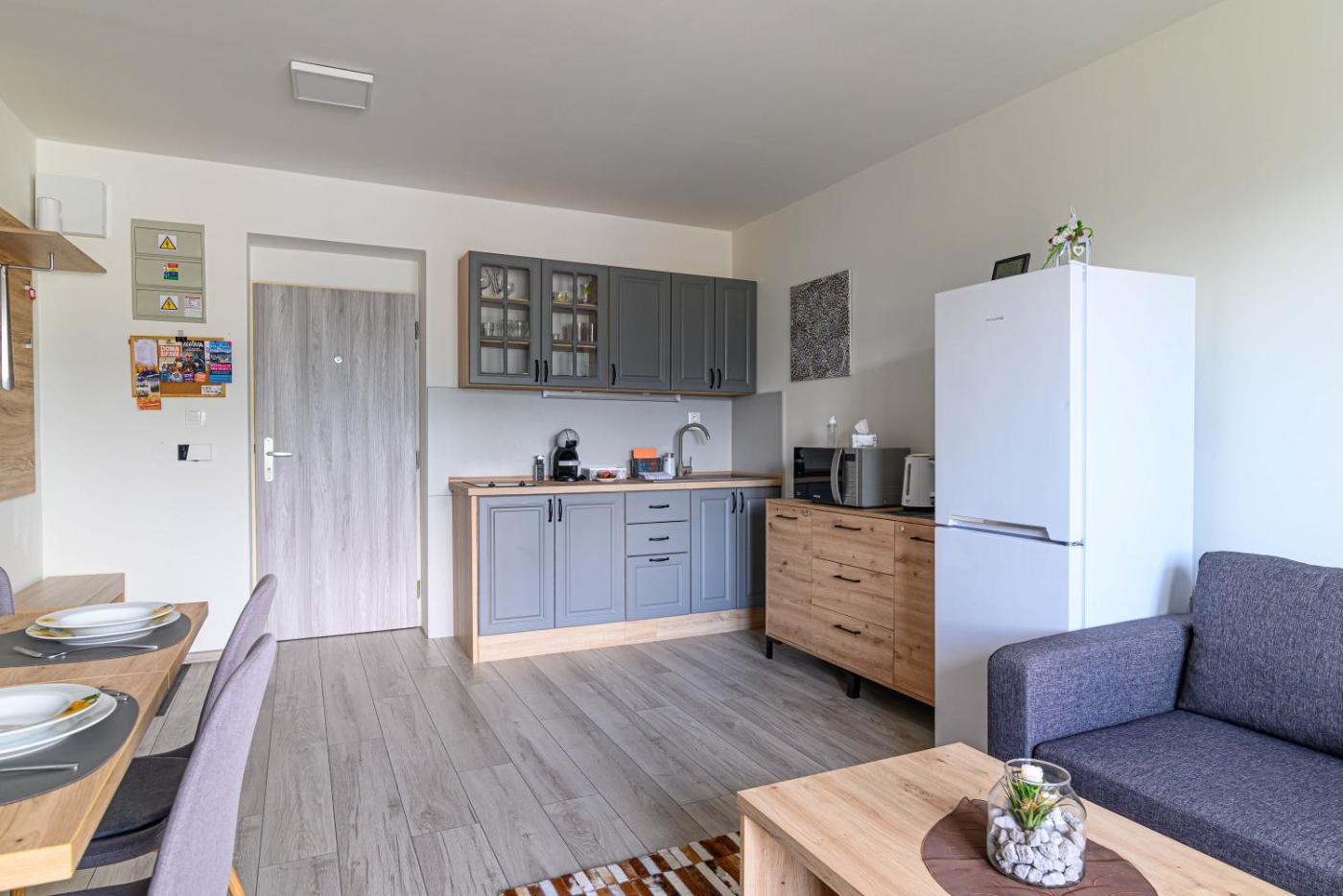 One-Bedroom Apartment. This apartment comes with 1 living room, 1 separate bedroom and 1 bathroom with a shower and free toiletries. In the well-fitted kitchen, guests will find a stovetop, a refrigerator, kitchenware and a microwave. This apartment has a washing machine, flat-screen TV with satellite channels, mountain views, as well as winechampagne for guests. The unit has 3 beds.