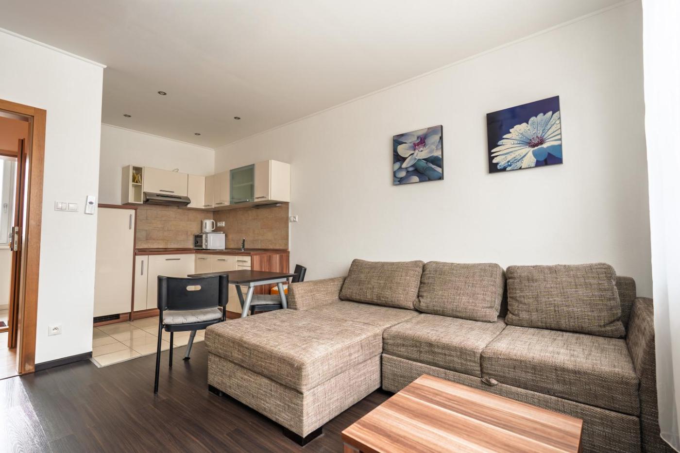 One-Bedroom Apartment. This air-conditioned apartment comes with a sofa bed, a seating area, a flat-screen TV with cable and satellite channels, a fully-equipped kitchenette with a dining table, ironing facilities, a safety deposit box and a private bathroom with a shower or a bath tub and free toiletries.