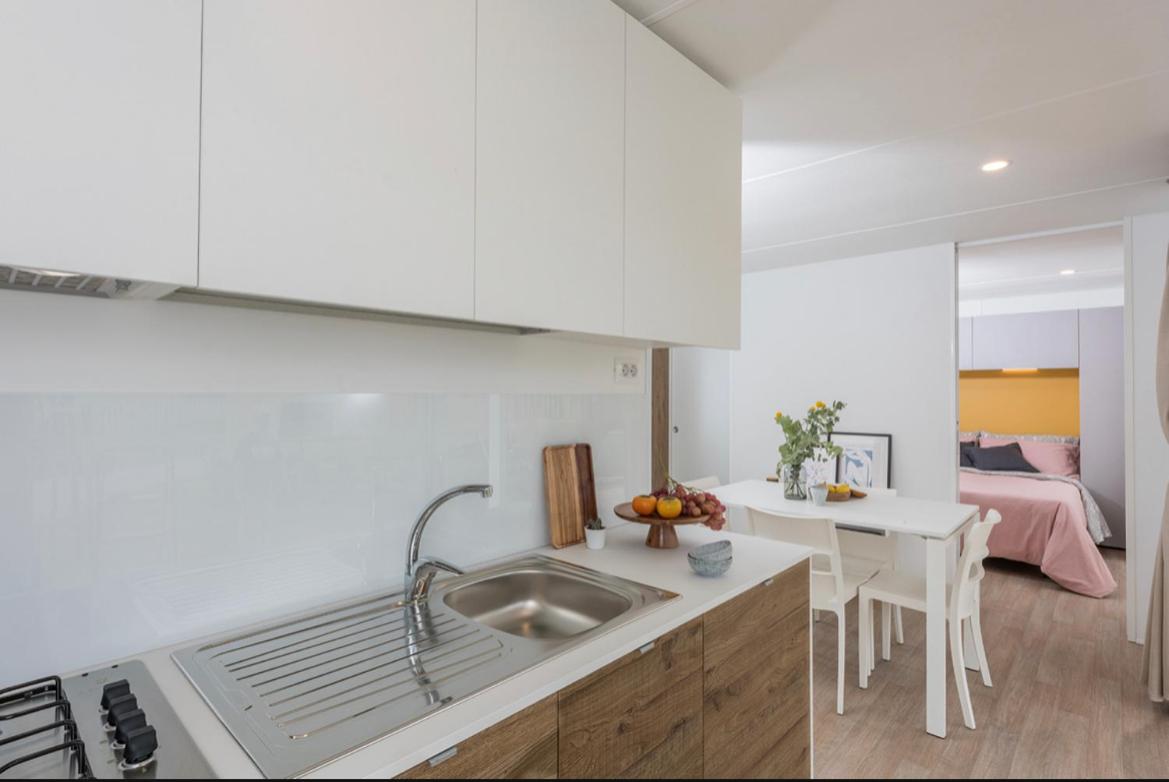 Mobile Home. This air-conditioned mobile home is comprised of 1 living room, 2 separate bedrooms and 1 bathroom with a shower. Guests will find a stovetop, a refrigerator and kitchenware in the kitchen. The mobile home also has a barbecue. Featuring a terrace with pool views, this mobile home also offers a tea and coffee maker and a flat-screen TV. The unit offers 5 beds. ;