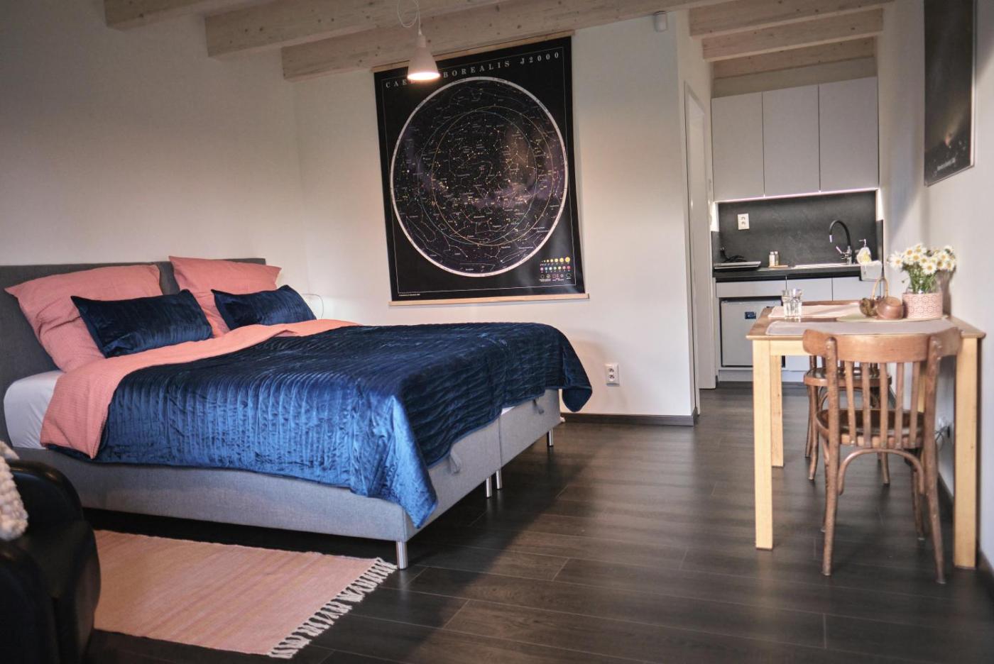 Classic One-Bedroom Apartment with King Bed. This apartments special feature is the hot tub. Featuring a private entrance, this apartment comprises a kitchenette, 1 bedroom and 1 bathroom with a bath and a hairdryer. Guests can make meals in the kitchenette that is equipped with a stovetop, a refrigerator, kitchenware and a tea and coffee maker. The apartment provides a washing machine, heating and mountain views. The unit offers 1 bed.